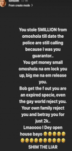 In new posts shared on her Instastories, Tonto alleged that Bobrisky sleeps with Yahoo boys, blackmails them and then gets paid. She also said that the ”gay world has rejected Bobrisky, likewise his family.”