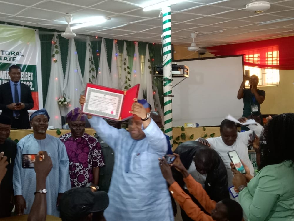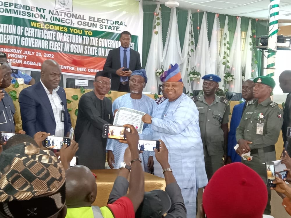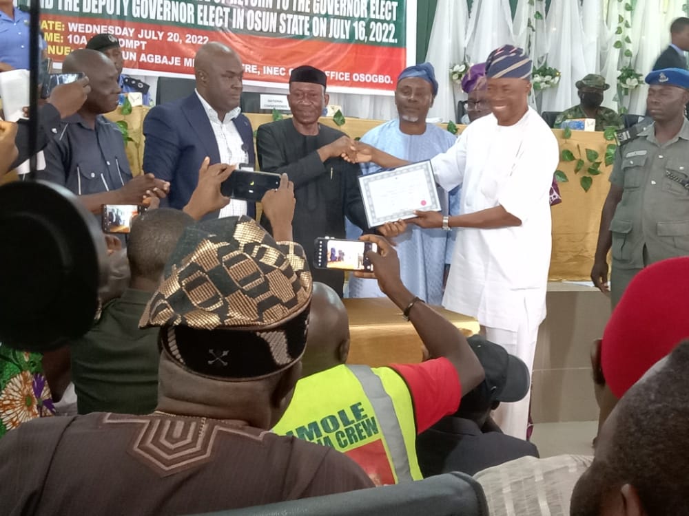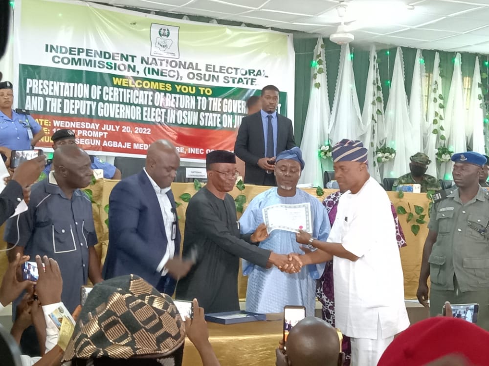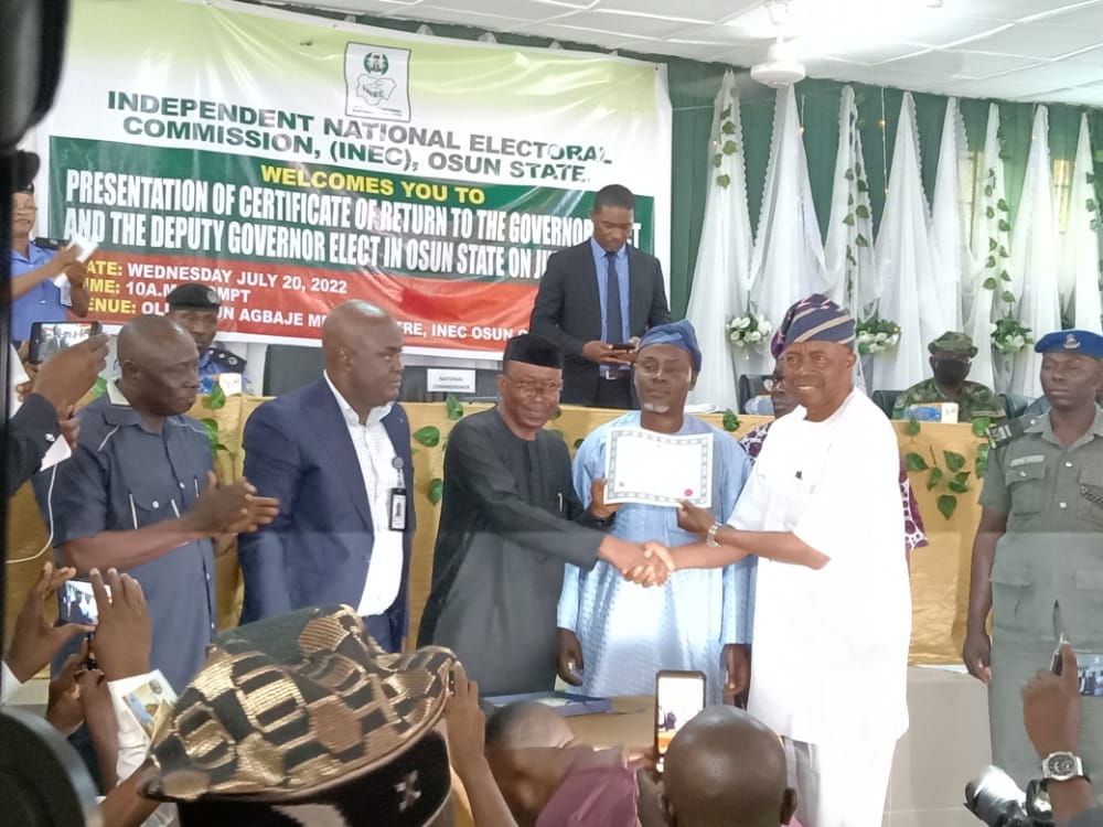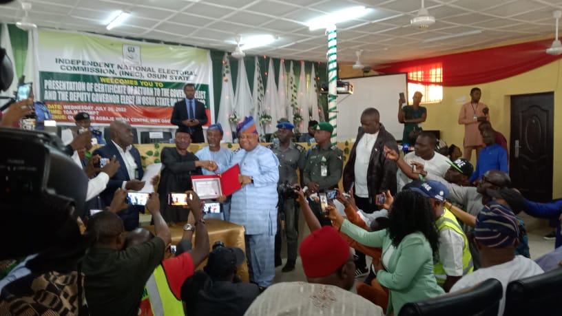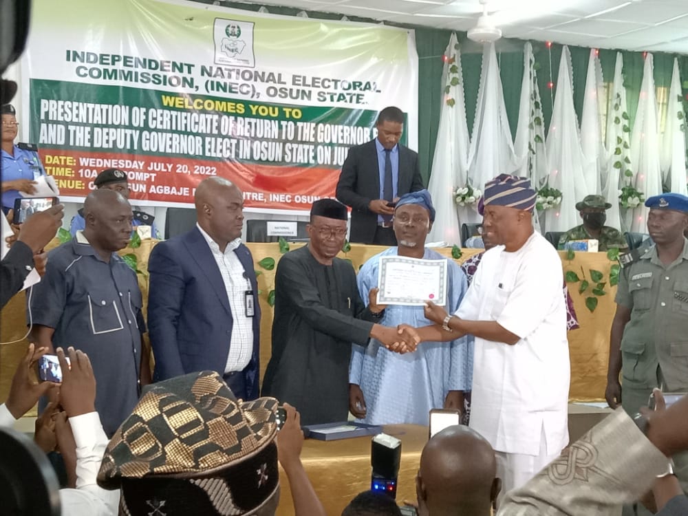 Senator Ademola Adeleke, the Osun State governor-elect, on Wednesday, received his Certificate of Return from the Independent National Electoral Commission (INEC).
